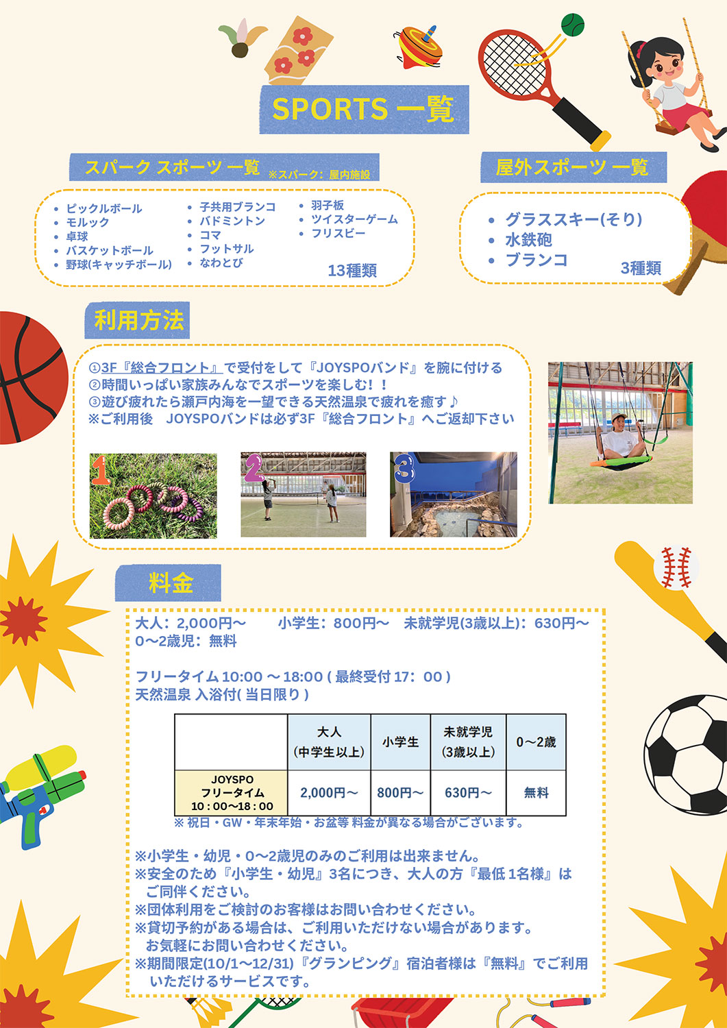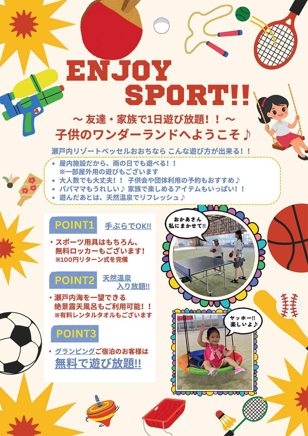 瀬戸内リゾートベッセルおおちの屋内スポーツ館施設「ENJOYSPORTS『JOYSPO』」は、雨天でも1日中遊べるがたくさん!